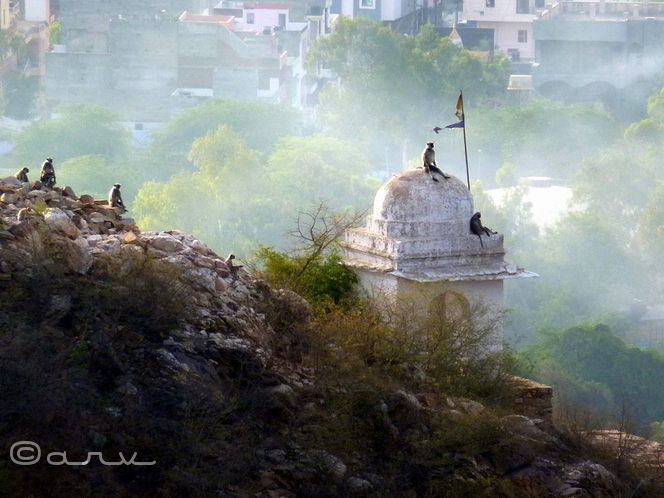 There was an entire troop of monkeys sitting around a small temple located at the base of the hill near Garh Ganesh temple. They were Gray Langur monkeys. This species is characterized by a black face, greyish brown color, and a long tail. Despite no similarity, they are also called Hanuman Langur and Langur Bandar in the local language.