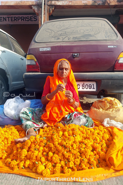 I was in Chandpol Bazaar, not far from the landmark point, Choti Chaupar not far from Chaturbhuj Temple. It is common to see flower sellers selling flowers in the streets of Jaipur’s walled city. These are temporary flower-sellers, unlike the ones you find on Badi Chaupar near Hawa Mahal or in the Phool Mandi or the wholesale flower market in Jaipur. I found a woman selling marigold flowers right next to the car parking in Chandpol Bazaar. She was busy making marigold garlands. I’m unsure what made me pause and strike up a conversation with her. She was composed, unlike most sellers who are extremely attentive and active in scouting for a potential customer among the passersby. Because of a large number of flower sellers in the old city Jaipur market, striking a sale deal is vital. But here she was not bothered with this issue at all.