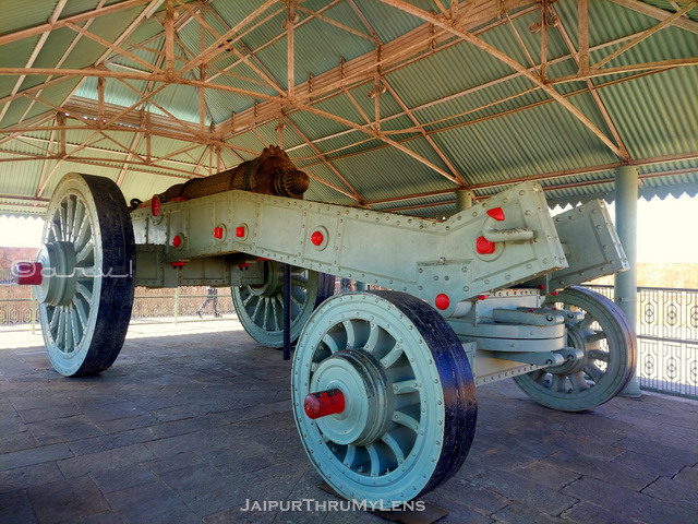 The official board mentioned the canon was fired more than once but never during a war. Over 100 kg of gunpowder was required to fire a 50 kg cannonball. The gun recoil was four feet; an eight feet screw was used to elevate the gun barrel. The cannon was cast at the gun foundry inside the fort in 1720 AD. The length of the cannon is 31’3″ and weighs 50 tons. The popular legend is that when it was test fired, the cannonball fell in Chaksu, a small settlement around 40 km from Jaipur. Another version mentions the cannonball landing in Tunga. It is difficult to verify which one is true.