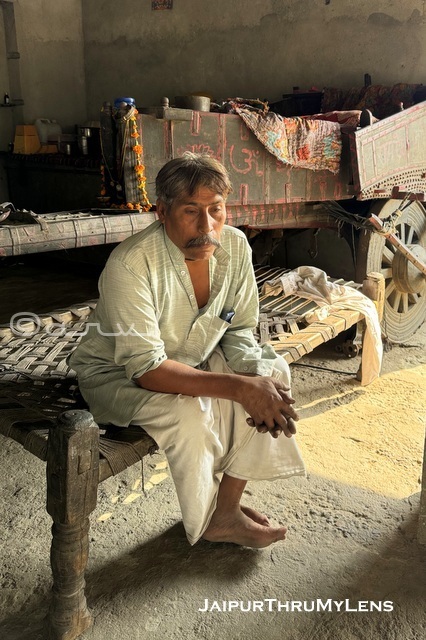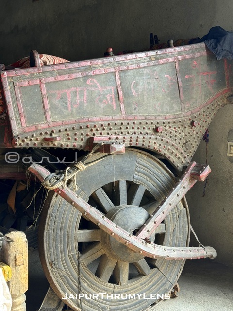 I was driving from Jaipur to neighbouring villages to explore stepwells near Jaipur. I was near a historic town where one of the most famous battles in Rajasthan was fought in the 18th century. It was a battle between the Maratha’s and Rajput armies. On the Maratha side, the forces were led by Mahadji Sindhia. Trying to locate markings or remembrance structures, I stopped to ask a local just outside the town. He explained in detail where to head and how to find the structures marking the famous battle. I noticed the building he was sitting in had an old cart.